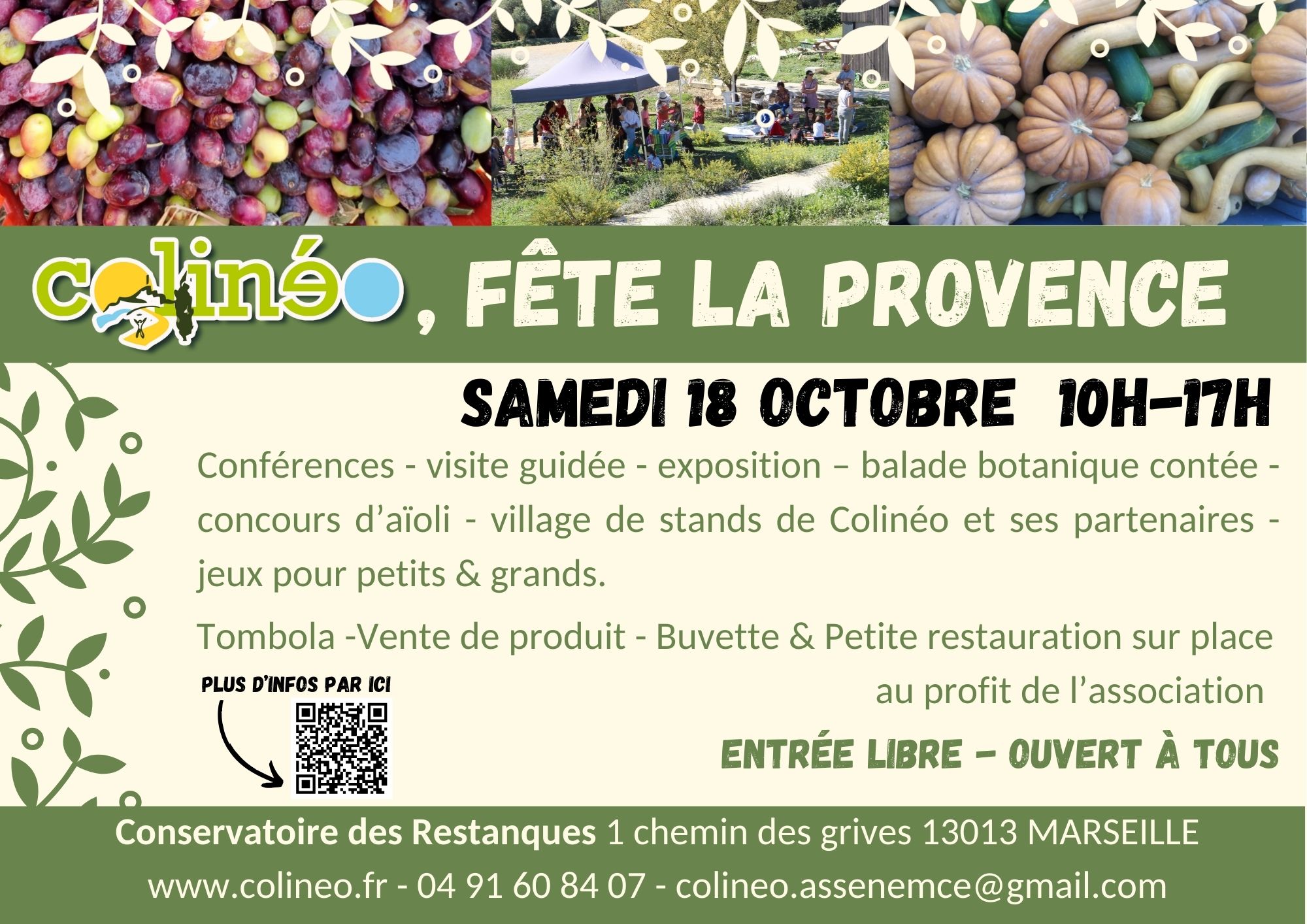 Au programme des festivités : conférences – visite guidée – exposition – balade botanique contée – concours d’aïoli – village de stands de Colinéo et ses partenaires – jeux pour Petits et grands – Tombola – Vente de produits – Buvette & Petite restauration sur place au profit de l’association.