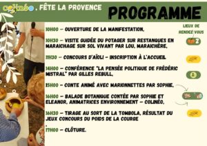 Au programme des festivités : conférence – visite guidée – exposition – balade botanique contée – concours d’aïoli – village de stands et jeux pour petits et grands – Tombola et autres surprises.
